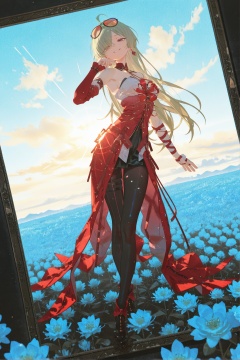 best quality,masterpiece,(ultra-detailed),(high detailed skin),border,oil painting border,photo frame,frame,a carefully framed painting,(bm tol:1.3),(ask \(askzy\):1.1),applepie \(12711019\),mr. j.w,by au_\(d_elete\),safe,extra_sharp,(perspective composition.:1.2),(bold_lines are adding to the overall style:1.2) solo,(high brightness:1.3),backlighting,blue rose field,outdoors,kubrick stare,1girl,contrapposto,half-closed eyes,detailed eyes,bold eyelashes,long eyelashes,nose,closed mouth,wide grin,smile,long hair,blue sky,clouds,amazing quality,masterpiece,highres,beautiful color,film grain,newest,symmetrical composition,beautiful,intricate,amazing quality,very aesthetic,absurdres,masterpiece,by anna dittmann,full body,dynamic angle,chromatic aberration,white skin,glossy skin,beautiful eyes,<lora:hongdou-ill-Tanger-000014:0.7>,Sweety \(Zenless Zone Zero\),1girl,eyewear on head,hair over one eye,purple eyes,breasts,ahoge,black footwear,<lora:Phrolova-ill-Tanger-000014:0.9>,(clothes: Phrolovadef red dress),black pantyhose,hair,bandages,asymmetrical detached sleeves,