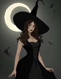 yydlds,a young woman standing in front of a full moon. A woman wearing a black witch hat and a black dress,The moon is partially visible in the top right corner of the image, with a crescent moon in the center. <lora:F.1暗黑女巫-手绘线条插画V1_遥远的炼丹师:0.8>