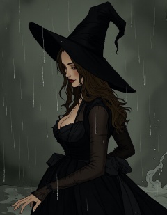 A woman wearing a black witch hat and a black dress,wet dress, rain drops, splash detailed, surreal dramatic lighting shadow (lofi, analog), kodak film, spike jonze, <lora:F.1暗黑女巫-手绘线条插画V1_遥远的炼丹师:0.8>