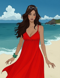 stands confidently on a sandy beach, dressed in a flowing red dress, adorned with a pair of trendy sunglasses on her head, her long, dark brown hair cascading over her shoulders, framing her radiant face, wearing a vibrant green bracelet, against a serene backdrop of a beach meeting a deep blue sky with a few wispy white clouds. <lora:F.1暗黑女巫-手绘线条插画V1_遥远的炼丹师:0.8>