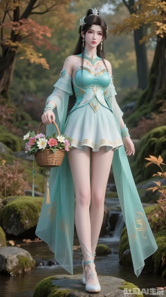 Action: “A beautiful woman stands on a stone, carrying a bamboo basket filled with fresh flowers of various colors”. Fingers. Nail art.