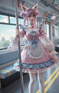 Xiaoli,a girl with long lavender or light purple hair styled in twin buns,sometimes with bangs framing her face. She has large expressive eyes,pale skin,and red lips. Cat ears are either part of her hairstyle or worn as a headband, she may also have a cat tail.,She stands in the middle of a subway car,captured from a low angle. Her body is slightly turned towards the viewer,and she holds onto a metal pole with her left hand. Her expression is calm and composed,with a gentle gaze that looks slightly off-camera.,She wears a frilly pink and blue maid outfit featuring:,- A frilly pink and white dress with blue accents,- White lace collar and cuffs,- Blue bow at the neck or chest,- Optional thigh-high stockings,- Pink choker with a dangling bell or heart pendant,- Large silver hoop earrings,- Silver choker with a pink gem,The subway car features soft pastel-colored seats (light blue and grey),yellow safety lines on the floor,and advertisements on the walls — one includes a blue background with red text. The windows show a glimpse of a fantasy world outside: a clear sky with floating clouds and dreamlike trees.,There are clean metal poles and handles throughout the car. Soft natural light filters through the windows,creating a calm and slightly surreal atmosphere.,Masterpiece,best quality,beautiful art,fantasy realism,CGI image,ultra detailed,clean and vivid atmosphere,full-body shot,panoramic view,looking slightly off-camera,silhouette color style.,