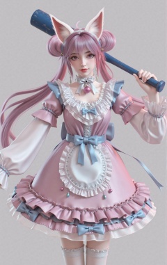 "A digital CG image of Xiaoli,a young woman with long lavender or light purple hair styled in twin buns,sometimes with bangs framing her face. She has large expressive eyes,pale skin,and red lips. Cat ears are either part of her hairstyle or worn as a headband, pink-furred ears. She wears a frilly pink and blue maid outfit which includes a frilly pink and white dress with blue accents,a white lace collar and cuffs,a blue bow at the neck or chest,optional thigh-high stockings,a pink choker with a dangling bell or heart pendant,large silver hoop earrings,and a silver choker with a pink gem. She holds a blue baseball bat over her shoulder with a confident expression. The background is simple,plain gray.",
