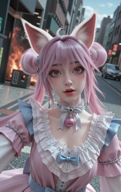 "Self-portrait of Xiaoli,a young woman with long lavender hair styled in twin buns and expressive eyes,pale skin,red lips,and pink-furred cat ears. She wears a frilly pink and blue maid outfit with white lace collar and cuffs. Taking a selfie with a shocked expression,one arm extended as if holding a camera or smartphone,in a running pose. The shot uses Dutch angle (tilted lens) and motion blur,adding unease and tension. Behind her is a chaotic city street with smoke and flames on the ground,scattered debris and garbage,but no other people. Clear and sunny sky casting bright light and sharp shadows.",