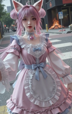 "Self-portrait of Xiaoli,a young woman with long lavender hair styled in twin buns and expressive eyes,pale skin,red lips,and pink-furred cat ears. She wears a frilly pink and blue maid outfit with white lace collar and cuffs. Taking a selfie with a shocked expression,one arm extended as if holding a camera or smartphone,in a running pose. The shot uses Dutch angle (tilted lens) and motion blur,adding unease and tension. Behind her is a chaotic city street with smoke and flames on the ground,scattered debris and garbage,but no other people. Clear and sunny sky casting bright light and sharp shadows.",