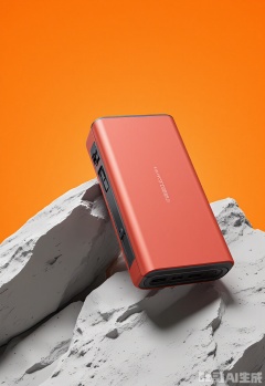 SMCJ, A powerful portable power bank with a high-capacity battery, lying on a textured, gray concrete surface against a vibrant orange backdrop. The power bank features multiple charging ports and a durable, rugged design. The contrasting colors make the product stand out. The concrete surface adds an industrial, robust feel.