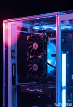 SMCJ, A high-performance graphics card with advanced cooling technology, installed in a transparent PC case against a dark, neon-lit background. The graphics card delivers exceptional gaming and rendering performance. The transparent case showcases its internal components. The neon lighting adds a futuristic, gaming-centric vibe.