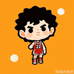 KACX, Digital drawing of a chibi-style character, Michael Jordan, in a basketball uniform and sneakers, with a competitive look and short black hair. The background is a solid orange color with two small white basketballs on either side of the character. The character has a small, round body and big, determined eyes, typical of chibi art. The drawing is simple and cute, with bold outlines and minimal shading.