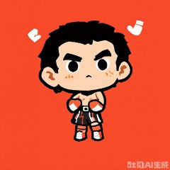 KACX, Digital drawing of a chibi-style character, Muhammad Ali, in a boxing outfit and gloves, with a confident stance and short black hair. The background is a solid bright red color with two small white boxing gloves on either side of the character. The character has a small, round body and big, powerful eyes, typical of chibi art. The drawing is simple and cute, with bold outlines and minimal shading.