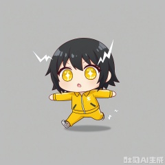 KACX, Digital drawing of a chibi-style character, Usain Bolt, in a track suit and running shoes, with a triumphant expression and short black hair. The background is a solid sunny yellow color with two small white lightning bolts on either side of the character. The character has a small, round body and big, energetic eyes, typical of chibi art. The drawing is simple and cute, with bold outlines and minimal shading.