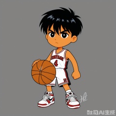 KACX, Digital drawing of a chibi-style character, Michael Jordan, in a basketball uniform and sneakers, with a competitive look and short black hair. The background is a solid orange color with two small white basketballs on either side of the character. The character has a small, round body and big, determined eyes, typical of chibi art. The drawing is simple and cute, with bold outlines and minimal shading.