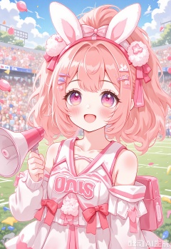 KANH, Digital drawing of a cute anime girl with wavy, coral pink hair styled in a high ponytail, wearing a pink and white cheerleader outfit with pom-poms, standing on a sports field with a cheering crowd in the background. She has large, energetic pink eyes, rabbit ears on her head, and a megaphone. The background is lively and vibrant, with a sense of team spirit and enthusiasm.