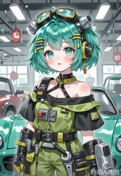 KANH, Digital drawing of a cute anime girl with short, teal green hair styled in a pixie cut with spikes, wearing a green and black mechanic's outfit with a tool belt and goggles, standing in a busy garage filled with cars and tools. She has large, determined green eyes, robot ears on her head, and a wrench. The background is industrial and active, with a sense of innovation and repair.