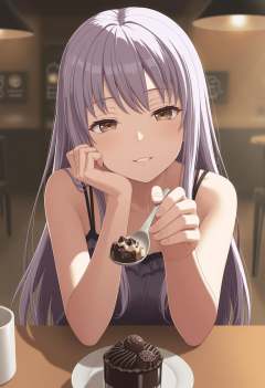 masterpiece,best quality,amazing quality,detailed eyes,beautiful face,volumetric lighting,dramatic shadows,cinematic lighting,upper body,from front,pov,close up,1girl,solo,embarrass,looking at viewer,parted lips,smile,head tilt,leaning forward,cafe,sitting,chocolate dessert,(incoming food:1.4),(feeding:1.6),dessert spoon,holding spoon,(reaching towards viewer:1.1),(reaching:1.1),(hands up),head rest on hand,volumetric lighting,shadow,urban:0.8,japansese street:0.8,rule of third,camisole,<lora:凑友希那:1>,Yukina Minato,brown eyes,long hair,purple hair,half squinting