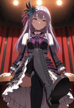 masterpiece,best quality,ultra-detailed,very aesthetic,sharp focus,vibrant colors,ray tracing,best lighting,detailed illustration,detailed background,cinematic,general,sensitive,explicit,neon,light,vibrant colors,glow,score_9,score_8_up,score_7_up,source_anime,looking_down,from_below,sit on the edge of the stage,stage,concert,sound,voicevox,red curtain,soft shadows,soft natural lighting,dramatic lighting,(rich tones:0.9),low angle,(gradient:1.1),looking_at_viewer,smile,(darkness:1.5),(foot focus:1.1),front view,crossed_legs,brown eyes,long hair,purple hair,diertao,bare shoulders,dier high-top black boots,dier purple bow bowtie,dier lace choker,dier cross-laced footwear,dier detached sleeves,dier earrings,dier feather hair ornament,frills,dier hair flower,dier lace-trimmed sleeves,long sleeves,dier skirt side black ribbon,dier layered dress,dier colorful skirts,<lora:凑友希那:1>