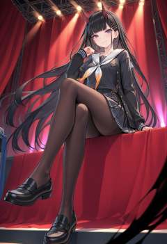 masterpiece,best quality,ultra-detailed,very aesthetic,sharp focus,vibrant colors,ray tracing,best lighting,detailed illustration,detailed background,cinematic,general,sensitive,explicit,neon,light,vibrant colors,glow,score_9,score_8_up,score_7_up,source_anime,looking_down,from_below,sit on the edge of the stage,stage,concert,sound,voicevox,red curtain,soft shadows,soft natural lighting,dramatic lighting,(rich tones:0.9),low angle,(gradient:1.1),looking_at_viewer,smile,(darkness:1.5),(foot focus:1.1),front view,crossed_legs,<lora:能代-000012:1>,black hair,gradient red horns,very long hair,purple eyes,blunt bangs,diyitao,school uniform,serafuku,black cardigan,black pantyhose,sailor collar,white sailor collar,x hair ornament,black serafuku,black skirt,pleated skirt,black shirt,neckerchief,long sleeves,open cardigan,loafers,brown pantyhose,cardigan,earrings,jewelry,hair ornament,hairclip,