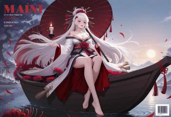 solo,(front view:1.3),looking_away,portrait,Cirrocumulus,Cirrostratus,sky,wind,petals,magazine cover,backlighting,text,masterpiece,best quality,amazing quality,very awa,absurdres,newest,very aesthetic,<lora:基础模型-000012:0.9>,disantao,white hair,red eyes,thick eyelashes,red lips,very long hair,white kimono,wide sleeves,hime cut,bare legs,bare shoulders,hair stick,tassel,nail polish,tattoo,toenail polish,barefoot,blunt bangs,kimono,spider lily,sash,red flower,holding,obi,boat,oil-paper umbrella,bow,breasts,cleavage,candle,collarbone,hair bow,hair flower,hair ornament,white eyelashes,mole under the eye,