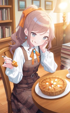 masterpiece,very aware,highres,absurdres,newest,best quality,(loli),petite,high quality,chromatic_aberration,White Theme,//,jewelry, food, plaid_dress, 1girl, plaid, holding, sitting, light_particles, plate, holding_food, dress, brown_hair, tongue, chair, earrings, brown_dress, tongue_out, solo, long_sleeves, shirt, blue_eyes, swept_bangs, pie, ponytail, brooch, hands_up, bow, white_shirt, pinafore_dress, table, orange_bow, :q, puffy_long_sleeves, bookshelf, indoors, collared_shirt, hair_bow, food_on_face, drawing_\(object\), picture_frame, book, sleeveless_dress, sidelocks, blurry, ribbon, buttons, puffy_sleeves, smile, on_chair, closed_mouth, orange_ribbon, neck_ribbon, long_hair, licking_lips, ascot, depth_of_field, glint, sleeveless, grey_eyes, collared_dress, high_ponytail, lamp, wooden_table, feet_out_of_frame, desk_lamp, book_stack, wooden_floor, wavy_hair, fruit, dot_nose, holding_plate, hand_up, saucer, hair_ribbon, hand_on_own_face, cup, ring//,artist:luvluvvox,artist:fukai ryosuke,[artist:Torino aqua],artist:minato hitori,hiten_(hitenkei),artist:rurudo,artist:lazuri7,artist:yunikon,//,absurdres,newest,very aesthetic,amazing quality,highres,sensitive,ultra detailed,best anatomy,HDR,8K,high detail RAW color art,high contrast,illustration,depth of field,(colorful),phenomenal aesthetic,detailed light,blurred picture,Tyndall effect,contrast,lens flare,cinematic lighting,//,<lora:PVC5——【noob】hans:0.3>,<lora:konya_karasue——【noob】hans:0.5>,<lora:pjsk-noob-hans:0.65>,