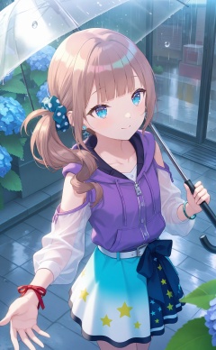 masterpiece,very aware,highres,absurdres,newest,best quality,(loli),petite,high quality,chromatic_aberration,White Theme,//,1girl, jewelry, umbrella, earrings, star_earrings, holding_umbrella, bracelet, blue_eyes, holding, solo, transparent_umbrella, blue_scrunchie, outdoors, flower, transparent, hair_ornament, wrist_ribbon, scrunchie, brown_hair, multicolored_clothes, hydrangea, side_ponytail, star_\(symbol\), belt, blunt_bangs, polka_dot_scrunchie, hood, shoulder_cutout, side_drill, zipper, collarbone, ribbon, smile, sparkle, hood_down, hair_scrunchie, polka_dot, multicolored_skirt, rain, buttons, closed_mouth, looking_up, tile_floor, blue_flower, purple_hoodie, skirt, purple_jacket, storefront, street, sunlight, leaf, see-through, jacket, blue_belt, sidewalk, road, day, tiles, dot_nose, light_brown_hair, outstretched_hand, long_sleeves, building, clothing_cutout, bow, waist_bow, zipper_pull_tab, long_hair, shop, looking_afar, see-through_sleeves, glint, standing, star_print, hair_over_shoulder, belly_chain, flower_earrings, blurry, wavy_hair, red_ribbon, white_belt, hooded_jacket, eyelashes, water_drop, hand_up, light_rays, drill_hair//,artist:luvluvvox,artist:fukai ryosuke,[artist:Torino aqua],artist:minato hitori,hiten_(hitenkei),artist:rurudo,artist:lazuri7,artist:yunikon,//,absurdres,newest,very aesthetic,amazing quality,highres,sensitive,ultra detailed,best anatomy,HDR,8K,high detail RAW color art,high contrast,illustration,depth of field,(colorful),phenomenal aesthetic,detailed light,blurred picture,Tyndall effect,contrast,lens flare,cinematic lighting,//,<lora:PVC5——【noob】hans:0.3>,<lora:konya_karasue——【noob】hans:0.5>,<lora:pjsk-noob-hans:0.65>,