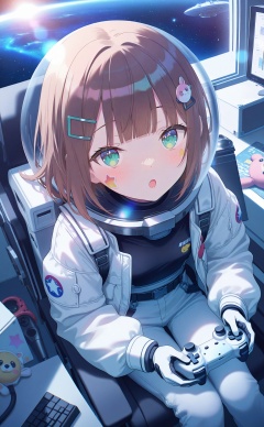 masterpiece,very aware,highres,absurdres,newest,best quality,(loli),petite,high quality,chromatic_aberration,White Theme,//,1girl, space_helmet, spacesuit, space, astronaut, helmet, cockpit, hair_ornament, solo, open_mouth, :o, star_\(sky\), brown_hair, looking_at_viewer, hairclip, jacket, planet, blue_eyes, long_sleeves, keyboard_\(computer\), star_\(symbol\), white_jacket, open_clothes, stuffed_toy, sitting, from_above, holding, spacecraft, window, blush, blunt_bangs, sticker, belt, controller, open_jacket, looking_up, puffy_long_sleeves, virtual_youtuber, starry_sky, joystick, monitor, indoors, green_eyes, computer, gloves, stuffed_animal, breasts//,artist:luvluvvox,artist:fukai ryosuke,[artist:Torino aqua],artist:minato hitori,hiten_(hitenkei),artist:rurudo,artist:lazuri7,artist:yunikon,//,absurdres,newest,very aesthetic,amazing quality,highres,sensitive,ultra detailed,best anatomy,HDR,8K,high detail RAW color art,high contrast,illustration,depth of field,(colorful),phenomenal aesthetic,detailed light,blurred picture,Tyndall effect,contrast,lens flare,cinematic lighting,//,<lora:PVC5——【noob】hans:0.3>,<lora:konya_karasue——【noob】hans:0.5>,<lora:pjsk-noob-hans:0.65>,