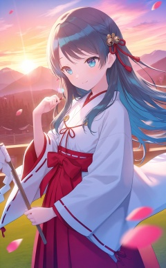 masterpiece,very aware,highres,absurdres,newest,best quality,(loli),petite,high quality,chromatic_aberration,//,1girl,solo,long_hair,japanese_clothes,hair_ornament,smile,bell,kobayakawa_sae,black_hair,sunrise,mountain,gohei,kimono,outdoors,blue_eyes,petals,blue_hair,miko,cloud,sunset,//,artist:luvluvvox,artist:fukai ryosuke,[artist:Torino aqua],artist:minato hitori,hiten_(hitenkei),artist:rurudo,artist:lazuri7,artist:yunikon,//,absurdres,newest,very aesthetic,amazing quality,highres,sensitive,ultra detailed,best anatomy,HDR,8K,high detail RAW color art,high contrast,illustration,depth of field,(colorful),phenomenal aesthetic,detailed light,blurred picture,Tyndall effect,contrast,lens flare,cinematic lighting,//,<lora:PVC5——【noob】hans:0.3>,<lora:konya_karasue——【noob】hans:0.5>,<lora:pjsk-noob-hans:0.65>,