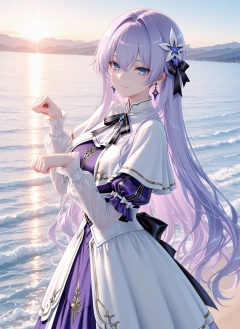 masterpiece,best quality,newest,absurdres,highres,soft shadows,year2024,mutou kurihito,(kimishima ao:0.7),(hiten \(hitenkei\):0.4),(sheya:0.4),<lora:Cantarella youngXLNAI:1>,Cantarella (\young\),1girl,light purple hair,blue eyes,hair ornament,hair between eyes,mole under eye,earrings,white capelet,puffy sleeves,long sleeves,purple dress,white dress,ocean,standing,paw pose,smile,,sunlight,mountainous horizon,