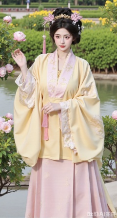 masterpiece, best quality, In spring, a Ming - style Hanfu girl wearing a goose - yellow beizi paired with a pink mamianqun shuttles through the flower bushes in the ancient - style garden. The goose - yellow beizi is made of light and thin gauze, embroidered with Song - style butterfly and flower patterns. The collar and cuffs are inlaid with light - pink lace, and goose - yellow silk - thread tassels hang from the cuffs. The mamianqun is embroidered with delicate peony patterns, and a pink coral yingluo hangs at the skirt gate. She wears a butterfly hairpin on her head, adorned with pink bead strings. She has pink pearl earrings and a pink crystal bracelet on her wrist. Flowers are in full bloom in the flower bushes, and butterflies are flying, creating a fresh and romantic spring scene,, (huge breasts, full breasts:2.99),Xhanfududou,Xsongzhihanfu,Xmingzhihanfu,XshixiaoyinyueY