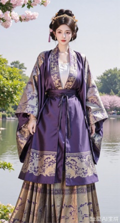 masterpiece, best quality, In autumn, a girl in Ming - style Hanfu, wearing a deep - purple stand - collar long gown paired with a brown Mamianqun, strolls in the chrysanthemum garden of the ancient - style garden. The stand - collar long gown is made of deep - purple silk, embroidered with golden chrysanthemum patterns using Song - style embroidery. The collar is embroidered with golden volute patterns, and the cuffs and hem are decorated with tassels made of golden silk threads. The Mamianqun is embroidered with Song - style chrysanthemum and bamboo patterns, and a brown jade yingluo hangs at the skirt gate. She wears a purple chrysanthemum hair crown on her head, inlaid with pearls. She has purple gemstone earrings and a string of amethyst bracelets on her hand. Chrysanthemums are vying for beauty in the chrysanthemum garden, and the garden pavilions in the distance have more charm against the backdrop of autumn, (huge breasts, full breasts), (huge breasts, full breasts:2.99),Xhanfududou,Xsongzhihanfu,Xmingzhihanfu,XshixiaoyinyueY