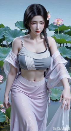 (masterpiece, best quality:1.2),1girl, navel, solo, midriff, bare shoulders, hair ornament, flower, hair flower, black hair, red lips,BREAK, (looking at viewer:1.39), chinese clothes,(Holographic black|white dress:1.39), (lace,Rainbow Gradient Color:1.29),BREAK,purple eyes,blurry, solo focus, long hair, lips, daytime, lipstick, outdoors, (upper body,,Long legs:1.29), blurry,(huge breasts,full breasts:1.41), background, 1girl, makeup, hair bun,Xyunxiao,(Blue sky:1.39),(Suzhou Garden Lotus Pond,pink lotus,green Lotus Leaf:1.39),(huge breasts, full breasts:2.99),Xhanfududou,Xsongzhihanfu,Xmingzhihanfu,XshixiaoyinyueY,XnaiqiXY