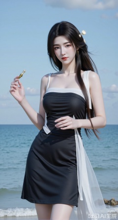 masterpiece, best quality, 1girl,solo,looking at viewer,( outdoor:1.3),sea,beach,realistic,midriff,bare shoulders,standting,hair ornament,long hair,jewelry,black dress,cowboy shot, (huge breasts, full breasts:2.99),Xhanfududou,Xsongzhihanfu,Xmingzhihanfu,XshixiaoyinyueY,XnaiqiXY