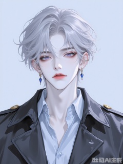 WMNH, A digital illustration of a young man with short, wavy silver hair, porcelain-like skin, and captivating violet eyes. He has a focused, determined look and is dressed in a dark gray trench coat over a light blue shirt. The coat features gold-trimmed buttons and a subtle brocade pattern. He wears a small blue sapphire earring in one ear. The background is a soft, pale blue. The style is detailed and semi-realistic, emphasizing the character's elegant and enigmatic aura.