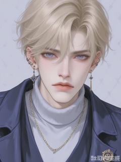 WMNH, A digital illustration of a young man with wavy, sandy blonde hair, fair complexion, and piercing sapphire blue eyes. He has a serious, contemplative expression and is wearing a navy blue blazer over a light gray turtleneck. The blazer has gold buttons and a subtle herringbone pattern. He sports a small blue lapis lazuli earring in one ear. The background is a plain, soft blue. The style is detailed and semi-realistic, focusing on the character's intelligent and thoughtful features.