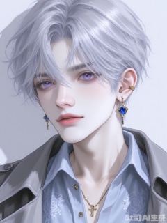 WMNH, A digital illustration of a young man with short, wavy silver hair, porcelain-like skin, and captivating violet eyes. He has a focused, determined look and is dressed in a dark gray trench coat over a light blue shirt. The coat features gold-trimmed buttons and a subtle brocade pattern. He wears a small blue sapphire earring in one ear. The background is a soft, pale blue. The style is detailed and semi-realistic, emphasizing the character's elegant and enigmatic aura.