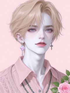 WMNH, A digital illustration of a young man with tousled, strawberry blonde hair, pale skin, and captivating deep blue eyes. He has a thoughtful, pensive expression and is wearing a dark gray sweater over a light pink shirt. The sweater has a subtle cable-knit pattern and silver buttons. He sports a small pink rose quartz earring in one ear. The background is a plain, soft pink. The style is detailed and semi-realistic, emphasizing the character's gentle and sensitive nature.