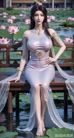 (masterpiece:1.2),best quality,The image is a digital illustration of a young woman sitting on a wooden bench in a pond with lily pads. She is wearing a long dress with design on the chest and sleeves. The dress has a high neckline and short sleeves,Holding a lotus in hand. She has long dark hair styled in loose waves and is wearing gold high heels. The woman is posing with one hand on her hip and the other resting on the edge of the bench. The background is filled with pink and white lotus flowers and green leaves. The overall mood of the image is peaceful and serene,(huge breasts:2.99),(full breasts:2.99),(Background with traditional Chinese architecture, lotus pond and pink lotus flowers:1.39),,XyunxiaoYK,Xbigbreasts,Xrixirenxiangsheying,Xmengru,XfuqingyunY,Xfenhanfududou,Xhanfusiwa,Xsonghanfu,XshixiaoY,XyunwangshuY