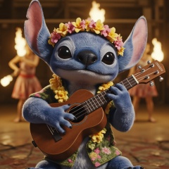 stt Wearing a floral shirt and playing the ukulele,with four paws messing up the strings,hula skirt dance background fire dancers,exaggerated expressions.,