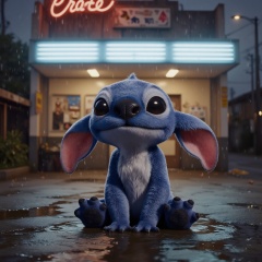 stt sits with his knees hugged,in a puddle under a neon sign,ears drooping behind him,wet and dripping fur,looking up at the rain,with a sense of loneliness.,