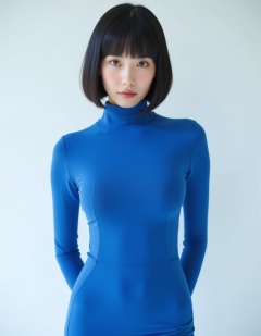 best quality, ultra high res, (photorealistic:1.4), RAW photo,(full-body shot),1japanese girl,( a woman with cat-like features, sharp almond-shaped eyes),a bob haircut,a slim body,blue-glossy tight skirt suit, professional, OL style,.