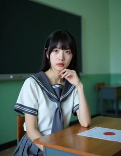A photograph of a young Asian woman with straight black hair and bangs, sitting at a desk in a classroom. She wears a traditional Japanese schoolgirl uniform: a white blouse with black trim, a grey pleated skirt, and a grey necktie. Her expression is neutral, and she rests her chin on her right hand, which is touching her cheek. The classroom background features green walls and a blackboard on the left. The desk has a Japanese flag sticker. The overall mood is contemplative and slightly melancholic.