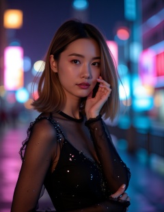 Photograph of a young woman with fair skin and shoulder-length brown hair, wearing a black, sheer, long-sleeve dress adorned with small, colorful sequins. She has a delicate, petite build and is standing outdoors at night, with a blurred cityscape featuring vibrant, colorful lights in the background. The woman's expression is calm and contemplative, her hand gently touching her face. The image is vibrant and has a dreamy, ethereal quality, enhanced by the soft bokeh effect of the city lights.