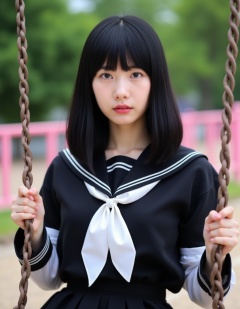 A photograph of a young East Asian woman with straight, shoulder-length black hair and bangs, wearing a traditional Japanese school uniform. The uniform is black with white accents, featuring a sailor-style collar and a white bow at the chest. She is sitting on a brown metal swing, holding the chains with both hands. The background includes blurred green trees and a pink fence. The woman has a neutral expression and light skin. The image is crisp and well-lit, suggesting it was taken during the day.