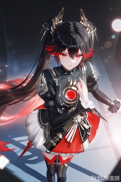 1girl,lucia, solo, long hair, bangs, black hair, hair ornament, thighhighs, long sleeves, dress, twintails, very long hair, red eyes, red hair, multicolored hair, black dress,gentle expression,parted lips,depth of field, light particles, lens flare, masterpiece,best quality,((artist:reoen),(artist:fuzichoco),(artist:atdan),(artist:torino_aqua:0.5),year 2024:0.5),(artist:omone_hokoma_agm:0.8), 2d, anime,from above,