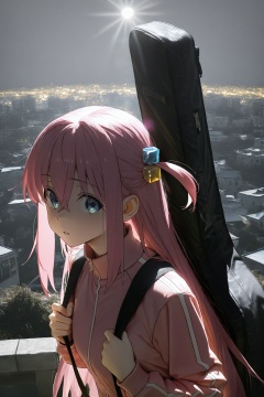 highres,absurdres,very awa,masterpiece,best quality,year 2024,newest,flat color,lineart,chiaroscuro,Natural Light,Mood Lighting,cinematic lighting,volumetric lighting,ray tracing,dramatic shadows,dappled light,photo background,\\,1girl,(solo:1.1),<lora:Zombie-Style-000059>,\\,1girl,solo,gotoh hitori,long hair,pink hair,blue eyes,pink jacket,cube hair ornament,hair ornament,jacket,simple background,upper body,instrument case,one side up,guitar case,track jacket,long sleeves,hair between eyes,grey background,holding strap,parted lips,cityscape,