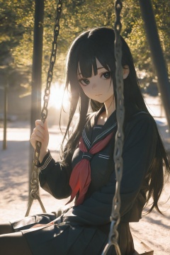 highres,absurdres,very awa,masterpiece,best quality,year 2024,newest,flat color,lineart,chiaroscuro,Natural Light,Mood Lighting,cinematic lighting,volumetric lighting,ray tracing,dramatic shadows,dappled light,photo background,\\,1girl,solo,<lora:Zombie-Style-000059:0.9>,\\, (upper body:1.6), 1girl, solo, long hair, skirt, school uniform, swing, pantyhose, black pantyhose, black hair, pleated skirt, looking at viewer, serafuku, sitting, red neckerchief, sailor collar, neckerchief, long sleeves, outdoors, bag, closed mouth, black eyes, shirt, black shirt, black skirt, black serafuku, feet out of frame
