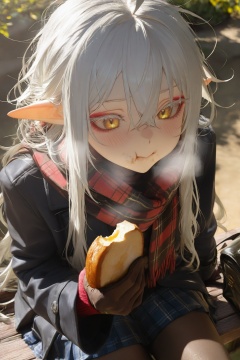 highres,absurdres,very awa,masterpiece,best quality,year 2024,newest,flat color,lineart,chiaroscuro,Natural Light,Mood Lighting,cinematic lighting,volumetric lighting,ray tracing,dramatic shadows,dappled light,photo background,\\,1girl,solo,<lora:Zombie-Style-000059:0.9>,\\,(face focus:1.5),simple background,(close-up:1.5),(portrait:1.1),upper body,1girl,solo,elf ears,very long hair,white hair,hair between eyes,(messy hair:1.3),ahoge,yellow eyes,red eyeshadow,long sidelocks,White dense eyelashes,sitting,outdoors,bag,bread,plaid scarf,gloves,long sleeves,black footwear,crossed legs,black coat,brown pantyhose,breath,pleated skirt,blue skirt,plaid skirt,blush,holding,eating,