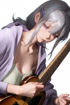 highres,absurdres,very awa,masterpiece,best quality,year 2024,newest,<lora:B3D-000198>,(white background:1.9),(simple background:1.9),drop shadow,(close-up:1.1),Focus on the face,looking at viewer,upper body,1girl,hair between eyes,long hair,(medium hair:1.1),grey hair,sidelocks,Lilac eyes,purple hairpin,light purple hooded jacket,Light green camisole,Light green dress,look down,leaning to the side,(leaning:1.3),holding instrument,(wood guitar:1.3),