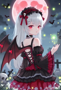 KANH, Digital drawing of a cute anime girl with straight, silver-white hair reaching down to her waist, wearing a black and red gothic lolita dress with lace details and a choker, standing in a mysterious graveyard under a full moon. She has large, mysterious red eyes, bat wings on her back, and a skull-shaped hair clip. The background is eerie yet beautiful, with ancient tombstones and glowing fireflies.