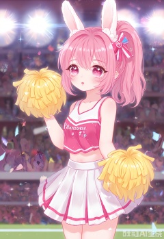 KANH, Digital drawing of a cute anime girl with wavy, coral pink hair styled in a high ponytail, wearing a pink and white cheerleader outfit with pom-poms, standing on a sports field with a cheering crowd in the background. She has large, energetic pink eyes, rabbit ears on her head, and a megaphone. The background is lively and vibrant, with a sense of team spirit and enthusiasm.