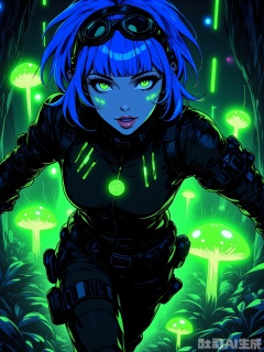 PKSN, Anime-style digital artwork of a young woman with short, pixie-cut blue hair with green streaks, wearing a black and green cybernetic jumpsuit with high-tech goggles on her forehead. She is running through a futuristic forest with her arms pumping and her legs striding, as if chasing after something. Neon green and blue lights from the bioluminescent plants and the floating drones around her create a surreal, natural environment. The setting is filled with towering trees, glowing mushrooms, and other exotic flora and fauna. The woman has a determined, excited expression and is looking ahead. The artwork has a sense of adventure and exploration with a focus on dynamic movement and vivid colors.