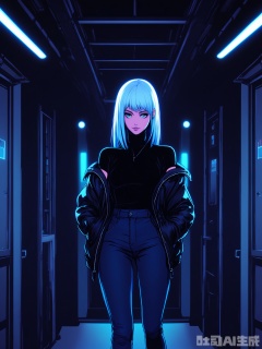 PKSN, Anime-style digital artwork of a young woman with short, spiky white hair with blue streaks, wearing a black leather jacket over a white turtleneck and black skinny jeans. She is walking down a futuristic corridor with her hands in her pockets and her head slightly tilted. Neon blue and white lights from the overhead fixtures and the glowing panels on the walls create a cold, sterile environment. The setting is a high-tech facility with sleek, minimalist design elements. The woman has a calm, collected demeanor and is looking straight ahead. The artwork has a sophisticated, modern look with a focus on clean lines and monochromatic colors with pops of neon.